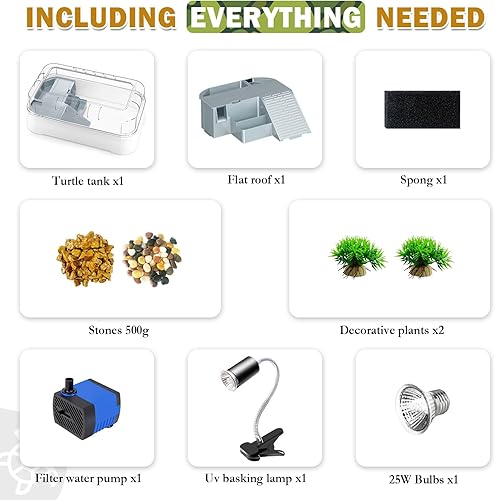 【All-In-One Reptile Starter Kit】: All the accessories needed for the tank starter pack are included in the package. 1*turtle tank, 1*lamp+1*bulbs,1* platform,1*Water pum, 1*sponge, 2*decorative plant, Wood grain stone(250g), cobble(250g) .Save you time and trouble shopping all the parts separately!