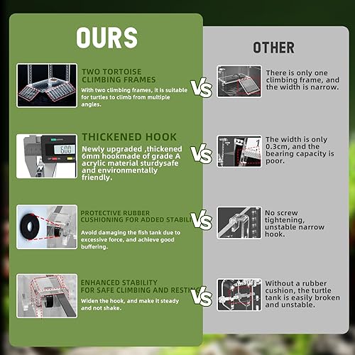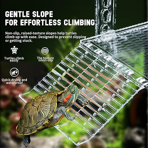 【Heavy-Duty Acrylic Platform, Holds up to 13 lbs】 Made of 0.25" thick UV-resistant acrylic, 30% stronger than standard basking platforms. Built to support aquatic turtles up to 11" long and 13 lbs in weight without sagging. Durable, easy to clean, and won’t yellow over time.