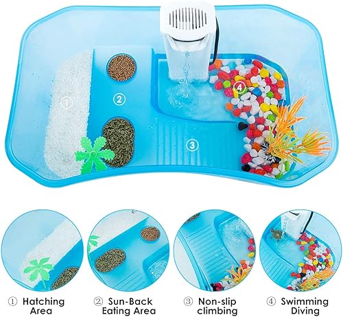 Five Different Function Area: The turtle aquarium has a breeding hibernation area, a rest tortoise basking with feeding area, a non-slip crawling area, and a diving swimming area, providing joy for your turtle reptile