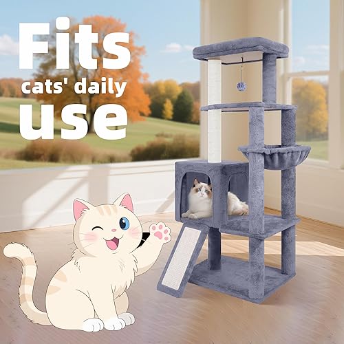 Multifunctional Design: Overall size 16.93"L x 13"W x 17.7"H. This cat cat tree is not only a climbing device, but also a comfortable sleeping platform, entertainment and play area, and a claw grinding board. Meet the various needs of cats