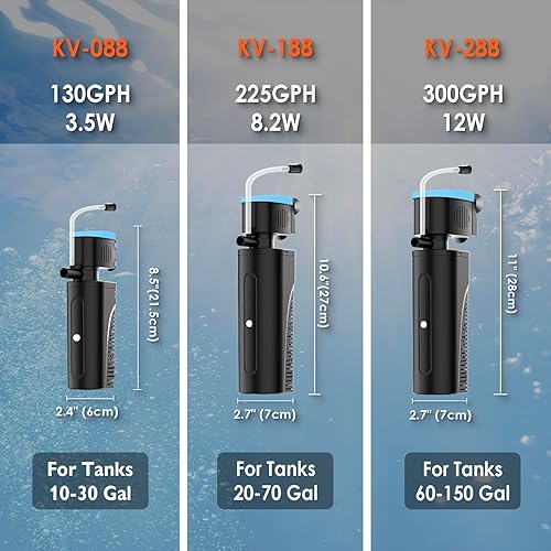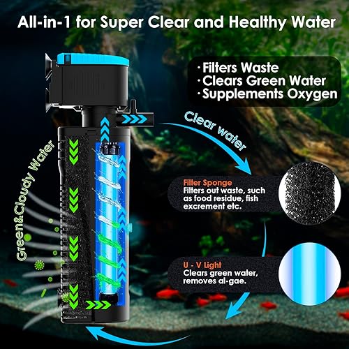 SPECIFICATION - With a Max Flow of 300GPH, Max lift of 4.5ft, and Power at 12W, this fish filter is perfect for 60-150 gallon tanks. It not only purifies green water but also boosts the tank's oxygenation and circulation levels.