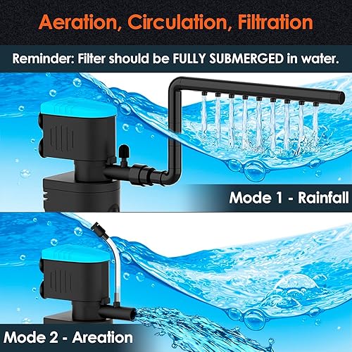 2-WAY FUNCTIONALITY – 1. Aerating Mode: Enhances oxygen supply with an air venturi and tubing, featuring adjustable airflow via the regulator. 2. Rainfall Mode: Channels filtered water through a spray bar, creating gentle surface agitation for even water distribution.