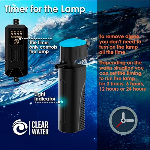 U - V LIGHT WITH TIMER - The aquarium filter comes with a 5W U - V light, dedicated to maintaining the cleanliness of the water in your tank. It also features a timer that offers 3/6/12/24 hour intervals, enabling you to schedule varying operation times based on your needs. Please note that the timer solely controls the light and not the pump.