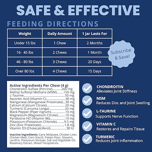 Powerful Ingredients for Joint & Disc Health: Each chew combines Chondroitin, MSM, and Turmeric to provide targeted neck and back support. Chondroitin nourishes cartilage for improved joint function, while MSM offers natural anti-inflammatory benefits to reduce disc swelling. Turmeric further supports immunity, keeping your dog feeling their best.