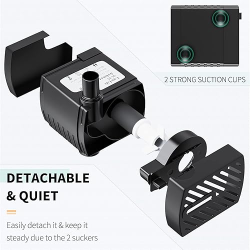 Detachable & Quiet: Easily detach the pump and clean it without any tool. The 2 strong suckers hold it steadily and keep it quiet. Ensure you and your pets a sound sleep.