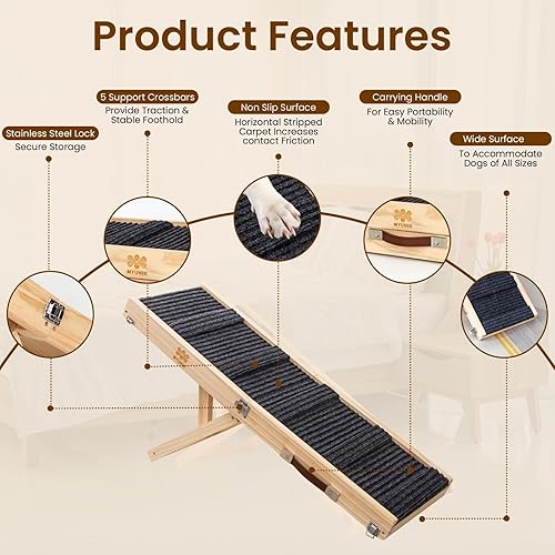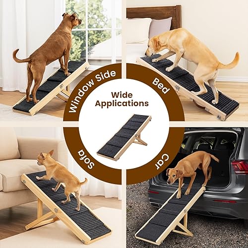 Adjustable Dog Ramp for Bed & Couch: Give your furry friend independence with our solid wood adjustable dog ramp for bed and dog ramp for couch. Designed with 5 height levels (10, 13, 15, 17.5 and 19.5 inches), this ramp for dogs to get on bed is perfect for small, medium, and large pets. The foldable pet ramp is crafted with a durable non-slip carpet, ensuring safe steps for dogs and cats every time.