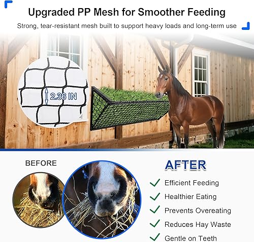 【Easy to Clean & Use】The knotless PP netting keeps hay from clogging and makes removing debris quick and simple. The galvanized steel frame resists rust and rinses clean easily, while weatherproof materials dry fast after washing for frequent reuse. Lightweight construction allows easy moving and handling. Designed for hassle-free daily cleaning and operation, this livestock hay feeder keeps your feeding area tidy and efficient, perfect for busy barns, stables, and pastures.