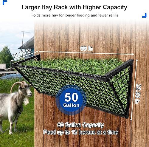 【Large Capacity & Wide Opening】Measuring 63" (L) x 22.8" (H) x 15.7" (W), this wall mouted hay rack provides approximately 50 gallon capacity with a wide top opening for quick and easy loading. The spacious design reduces refill frequency, boosts feeding efficiency, and accommodates multiple animals or larger feeding needs at the same time. Ideal for stables, barns, pastures, and paddocks, making it a versatile option for various farm setups and livestock environments.