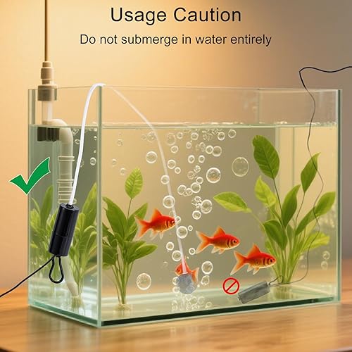 Versatile Usage. Suitable for fish tanks, aquariums, and outdoor fishing. A reliable fish tank pump to oxygenating whether at home or on the go. Keep pump body dry—do not place the device directly into water during use.