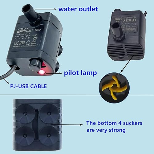 3.USB interface design: The small submersible pump is no longer the traditional plug type, but a wider applicability of the USB interface, almost can be inserted into all the USB interface power supply, so that it will be more convenient to use. Brushless DC smooth operation, low noise, maximum volume up to 40db, please fully immersed in the pump when using. There are 4 rubber suction cups on the bottom that can be attached to the smooth surface, reducing noise and vibration