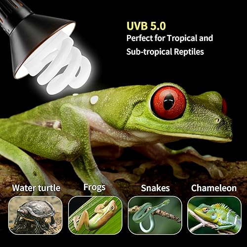 Suitable for tropical rainforest reptiles: The UVB 5.0 reptile light bulb is suitable for tropical rainforest reptiles, including iguanas, chameleons, lizards ,snake, frogs, toads and tortoise. Taking a few hours of UVB light every day can greatly enhance the vitality of reptile pet crawling and prevent and treat diseases.