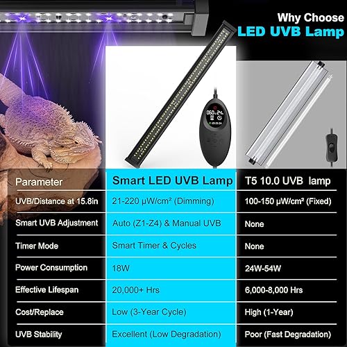 Energy-Saving Light: 28.5inch ultra-long light fixture, adopts high-efficiency LED and UV beads, the efficiency increased by 40% compared to others, brighter than ordinary plastic reptile light. Providing high-level UVB output, save energy while maintaining high brightness. Create a natural lighting environment for reptiles. 4 auto modes simulate sunrise and sunset to achieve even but fast UVI output, bring your pet back to nature.