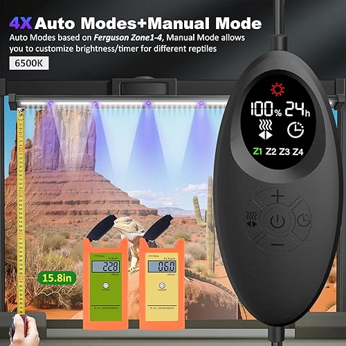 Exclusive Auto & Manual Modes: The handy controller offers 4x auto lighting modes(Z1/Z2/Z3/Z4) and customized Manual Mode, meet various requirements. Covering Ferguson Zones1-4. The manual mode allows you to customize the light intensity and timer based on your pets’ specific needs, ensuring the most comfortable living environment. Brightness output percentage range from 0-100%, Timer setting range is 1-24h, press +/- to adjust.