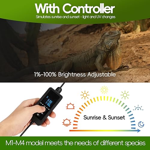【Customizable Lighting Modes】Multi-Mode Options to Meet Different Needs: The controller offers four light smart modes (M1/M2/M3/M4) to adapt to various environmental needs, covering Ferguson zones 1-4. The manual mode (M0) allows you to customize the light intensity based on your pet's specific needs(Light intensity adjustable from 1% to 100%),ensuring the most comfortable lighting environment,promoting optimal circadian rhythms in your pets.