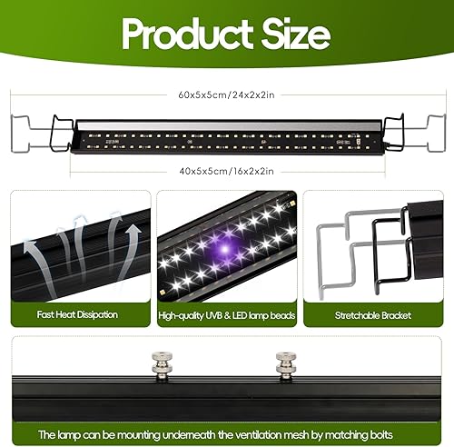 【Versatile Installation】The light can be easily mounted on the tank's mesh, Use the included brackets to place it on top of the pet tank's or hung inside using the included bolt,providing flexible setup options to suit your reptile's enclosure.Adjustabl bracket: Adjustable 10cm/4inch on one side and up to 20cm/8inch on both, fits most reptile tanks with or without lids.This 15W LED UVB Light for 40-60cm/16-24 inch reptile tank.