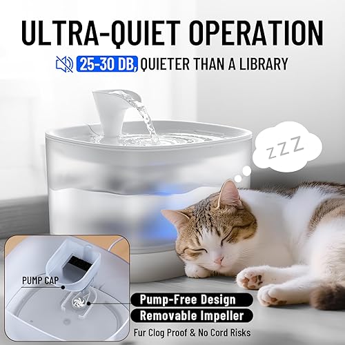 Quiet Operation, Only 25-30dB: The pet water fountain runs quietly, with very little noise from the machine or water flow. It’s energy-efficient and won’t disturb your home’s peace and quiet. Note: When the water level is near or below the MIN line, the fountain may make noise. Refill above MIN to restore quiet, stable operation.