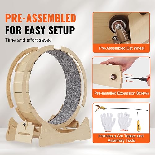User-Friendly Design: Easy installation with pre-installed expansion screws and wheel, saving you valuable time. Included accessories like gloves, a screwdriver, and a cat teaser add extra convenience. This cat treadmill is a breeze to clean with a non-scratch detachable looped mat, easily spot-cleanable with a cloth or sponge.