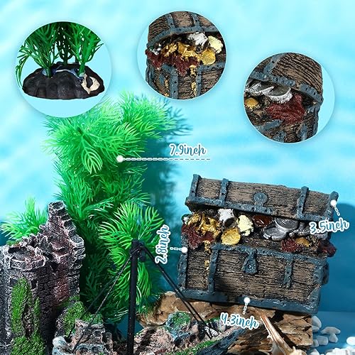 Complete Aquarium Decorations Package: our package includes a castle, a sunken shipwreck, a chest box, and seagrass, fulfilling most fish habitat decoration needs; These pieces add much needed diversity to your fish tank, providing caves of different sizes for your fish to explore and play, amplifying the happiness of owning an aquarium