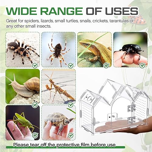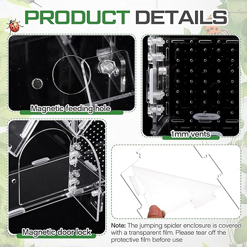 Full 360 Degree Visibility: this acrylic tarantula enclosure transparent walls allow unobstructed observation of pet behavior and feeding; Features magnetic feeding ports and secure magnetic doors for easy, tool free access while preventing escapes, please tear off the protective film before use