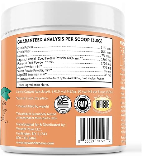 NASC CERTIFIED: Wonder Paws is a member of the prestigious National Animal Supplement Council (NASC), which ensures strict quality control standards. Wonder Paws pet pumpkin powder is NASC Certified so you know you are getting a trusted product that adheres to stringent quality controls. Our organic pumpkin fiber for dogs is manufactured in the United States with globally sourced ingredients in an FDA registered and GMP Certified facility.