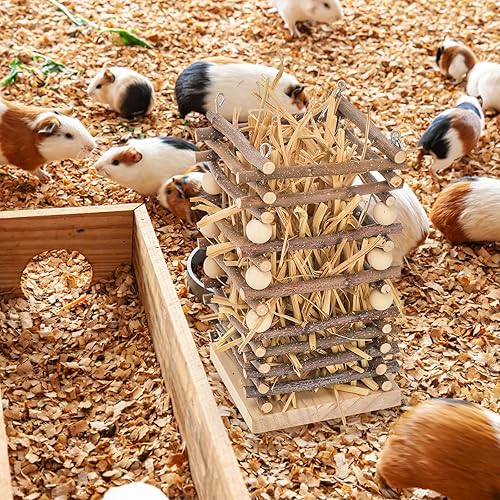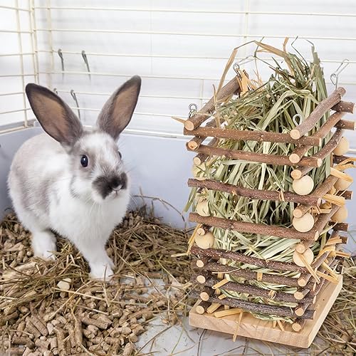 Perfect Size: Our wood rabbit hay feeder measures 4 x 4 x 7 inch (L x W x H), which can hold a whole day of hay for guinea pigs or bunnies. With the enough capacity and less wasted design, you don't need to add grass frequently in a day and ensure your pets eat fresh grass every day. Please notice that this product includes a self pet feeder only, no hay involved.
