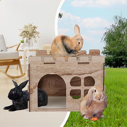 【Easy Use and Portablilty】This rabbit hiding house only requires 5 panels to put together. The wood castle can be disassembled and stored flat to save storage space. The convenient side panel handles make it easy to transport the bunny house, providing a portable solution that's perfect for travel or storage.