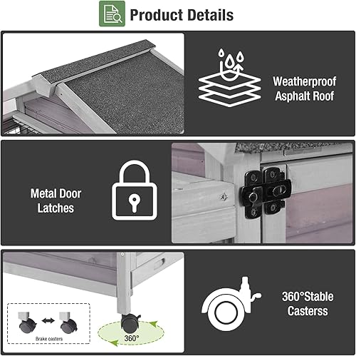 Mobility and Convenience: The bunny hutch is equipped with four wheels that provide exceptional mobility. Easily move the hutch around your yard or inside your home. Each wheel comes with a locking mechanism that allows you to secure the hutch in place when needed.