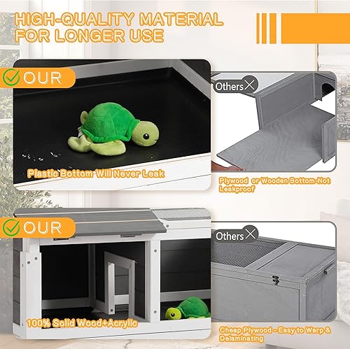 Excellent Solid Wood Construction Provides Stability:Turtle habitat is made of high-quality solid wood,which makes the overall structure more stable and provides a longer lifespan.Equipped with precision connectors, the turtle cage is not prone to dislodgement of accessories during use