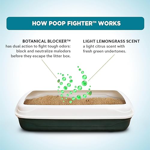 POOP FIGHTER MAXIMUM ODOR DEFENSE — A natural and sustainable cat litter designed to eliminate poop stink, not just mask it. This naturally safe multiple cat formula with dual-action Botanical Blocker immediately neutralizes poop & urine odors.