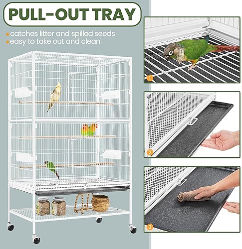 Clean With Ease: The two large doors make cleaning a breeze. The pull-out tray under the parrot cage can be removed and cleaned with water. The metal grate separates the birds and the tray to ensure the well-being of your birds and maintain the cleanliness of the cage