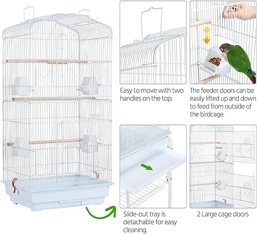 Pet-parent Friendly: You can easily lift and move the cage by holding the two handles on top. Each front door has two small entrances. The side panels feature 4 feeding doors for easy seed and water refilling. The extra storage shelf on the stand can keep bird cage cleaning tools, bird seeds and toys