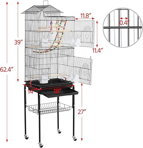 Considerate designs: Large bird cage features 0.4’’ bar spacing to keep your birds safe in the cage; 2 side-opening composite doors convenient for birds in small size like canaries, budgerigars, cockatiels, parakeets to use; 7 small doors are prepared for assembling feeders (included), breeding box (not included) and bird bath (not included)