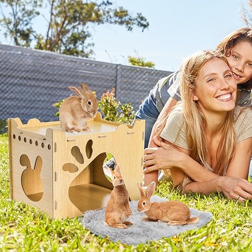 Yesland's Wooden rabbit hideout provide endless fun for your pets. The size of bunnies castle: 16.1” (L) x 12.6”(W )x 12.6” (H). Give enough space for the bunny, cats, adult guinea pigs, hamsters, chinchilla, ferretsnd various small animals to play, hide, rest and sleep in it.