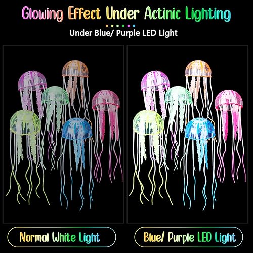 Multipurpose Jellyfish: these artificial jellyfish decors will move with the water flow and glow under LED lighting, bringing a fantastic glowing sea world landscape for both salt and fresh water tanks, decorative aquariums, fish tanks and more; This ornament will not automatically glow in the dark, it's beautiful in black or white light, but even more charming in blue light