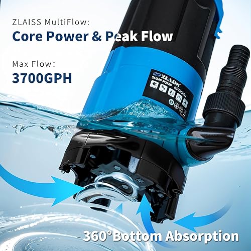 FUNCTIONALLY EFFICIENT - ZLAISS 1HP portable submersible pump, which features a flow rate of 3700 GPH per hour (62 gallons per minute), a maximum delivery height of up to 30 feet, and the ability to pass particles up to 1/5", ensures the pump can run more efficiently.